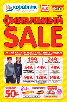 С 1 по 14 февраля 2017 г. в детских магазинах «Кораблик» финальная распродажа – максимальные скидки на одежду, обувь, игрушки, сезонные товары и многое другое!