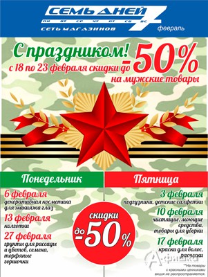 В феврале 2017 г. в сети магазинов парфюмерии, косметики и бытовой химии «7 дней» в Белгороде действуют праздничные скидки до 50% на различные группы товаров!
