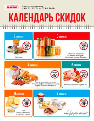 Со 2 по 7 февраля 2017 г. в универсамах «Магнит» проходит акция «Календарь скидок»! Каждый день скидки до 20% на разные категории товаров.