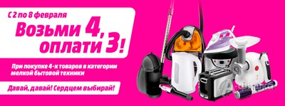 В магазинах бытовой техники и электроники «Media Markt» до 8 февраля 2017 г. снова проходит акция «Возьми 4, оплати 3» – при покупке 4-х товаров бытовой техники наименьший по стоимости товар Вы получите бесплатно!