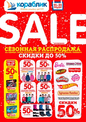 С 11 по 31 января 2017 г. в детских магазинах «Кораблик» сезонная распродажа – скидки до 50% на одежду, обувь, игрушки, детское питание, санки, снегокаты, ледянки, коньки и многое другое!