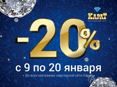 С 9 по 20 января 2017 г. в магазинах ювелирной сети «Карат» в Белгороде время выгодных покупок – действует скидка 20% на всё!