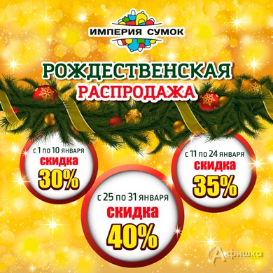 В январе 2017 г. в магазине «Империя сумок» в Белгороде проходит рождественская распродажа! С 1 по 10 января скидка 30%, с 11 по 24 января скидка 35%, с 25 по 31 января скидка 40%!