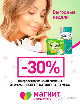 В сети магазинов «Магнит Косметик» проходит акция «Выгодные недели». С 1 по 7 января 2017 г.скидка 30% на средства женской гигиены!