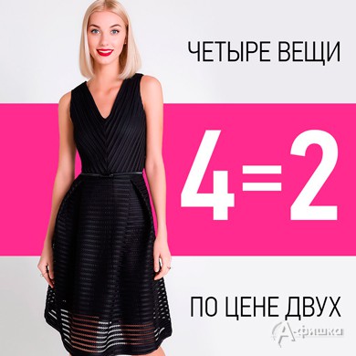 В магазине женской одежды «Concept Сlub» в Белгороде только до 20 декабря 2016 г. проходит акция «4=2» – при покупке четырёх вещей две вещи по наименьшей стоимости Вы получите в подарок!