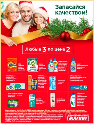 До 31 декабря 2016 г. во всех универсамах «Магнит» проходит акция «Запасайся качеством!» – при единовременной покупке трех товаров-участников акции самый дешевый из них предоставляется бесплатно!