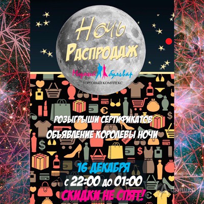16 декабря 2016 г. с 22:00 до 01:00 в Торговом комплексе «Модный Бульвар» пройдёт Ночь распродаж! Скидки и акции во всех магазинах, розыгрыши призов и сертификатов!