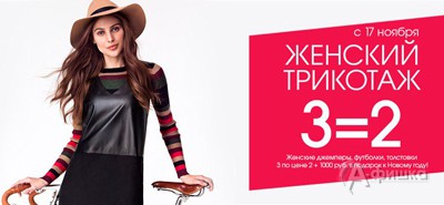 В магазинах одежды «Incity» с 17 по 23 ноября 2016 г. проходит акция «3=2» на женский трикотаж – при покупке двух вещей третья в подарок! 1000 бонусных руб. на клубную карту в подарок к Новому году!