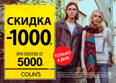 Только до 21 ноября 2016 г. в фирменных магазинах одежды «Colin’s» проходит акция – при покупке от 5000 руб. скидка 1000 руб. в подарок!