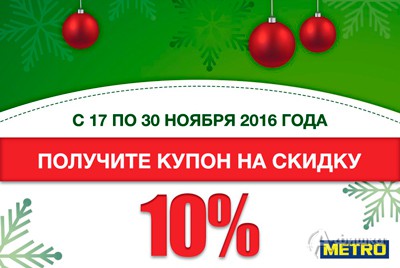 С 17 по 30 ноября 2016 г. в «METRO Cash & Carry» в Белгороде проходит акция «Получите купон на скидку»! При покупке товаров на сумму от 3000 руб. получите купон на скидку 10%!