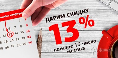 13-го числа каждого месяца в магазине обуви, сумок и аксессуаров «ЦентрОбувь» в Белгороде действует скидка 13% на все товары!