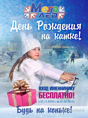 С 1 ноября 2016 г. по 1 марта 2017 г. на катке «МегаЛёд» проходит акция «День рождения на катке» – вход на каток имениннику бесплатно!