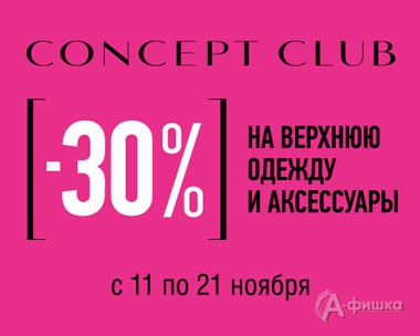 В магазине женской одежды «Concept Сlub» в Белгороде с 11 по 21 ноября 2016 г. действуют скидки до 30% на верхнюю одежду и стильные аксессуары!