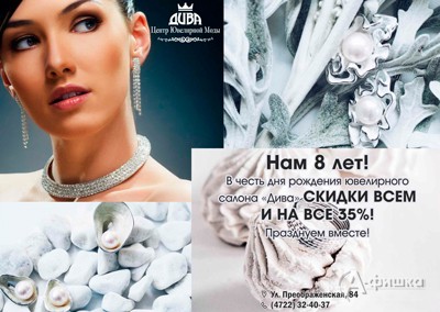 В честь Дня рождения ювелирного салона «Дива» в Белгороде с 15 ноября по 15 декабря 2016 г. действует акция – всем и на всё скидка 35%!