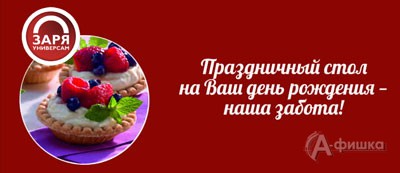 В универсаме «Заря» специальное предложение к Вашему Дню рождения – всю неделю скидка 20% на все блюда кондитерского и кулинарного отдела собственного производства!