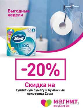 В сети магазинов «Магнит Косметик» проходит акция «Выгодные недели». С 8 по 14 ноября 2016 г. скидка 20% на туалетную бумагу и бумажные полотенца Zewa!
