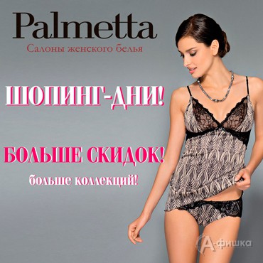 В фирменных салонах женского белья «Palmetta» с 11 по 27 ноября 2016 г. проходят «Шопинг-дни»! Вас ждут специальные цены на модные коллекции белья и купальников! Скидки до 40%!