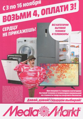 В магазине бытовой техники и электроники «Media Markt» до 16 ноября 2016 г. проходит акция «Возьми 4, оплати 3» – при покупке 4-х товаров бытовой техники и телевизоров наименьший по стоимости товар Вы получите бесплатно!