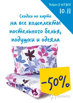 Только 10 ноября 2016 г. в гипермаркетах «Лента» в Белгороде пройдет акция – скидка 50% на все комплекты постельного белья, подушки и одеяла по карте «Лента»!