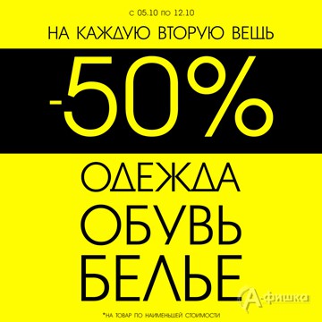 В магазине «Takko Fashion» в Белгороде с 5 по 12 октября 2016 г. действует предложение – скидка 50% на каждую вторую вещь с наименьшей ценой в чеке! Акция действует на категории: одежда, обувь, бельё.