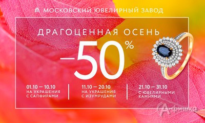 С 1 по 31 октября 2016 г. в магазинах «Московского ювелирного завода» проходит акция «Драгоценная осень» – на ювелирные изделия со вставками скидка 50%!