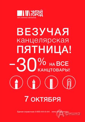 7 октября 2016 г. в сети книжных магазинов «Читай-город» пройдет акция «Везучая канцелярская пятница»! В этот день будет действовать скидка 30% на все канцтовары!