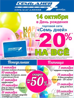 В октябре 2016 г. в сети магазинов парфюмерии, косметики и бытовой химии «7 дней» в Белгороде каждый понедельник и каждую пятницу проходит акция – скидки до 50% на различные группы товаров!