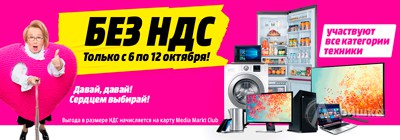 В магазине бытовой техники и электроники «Media Markt» только с 6 по 12 октября 2016 г. проходит акция «Бытовая техника без НДС» – выгода в размере НДС 18% зачисляется на бонусную карту! Участвуют все категории бытовой техники!