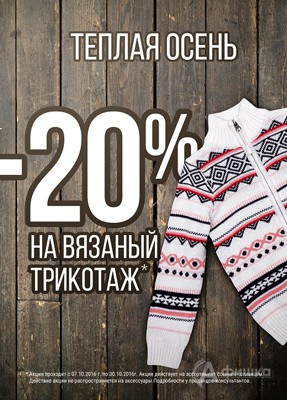 С 7 по 30 октября 2016 г. в магазине детской одежды «Play Today» в Белгороде проходит акция «Тёплая осень» – скидка 20% на вязаный трикотаж!