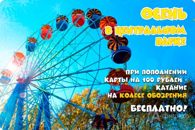 В белгородском Центральном парке культуры и отдыха им. Ленина проходит акция «Осень в Центральном парке» – при пополнении карты «Тропикано» на 100 руб. получите басплатное катание на «Колесе обозрения»!