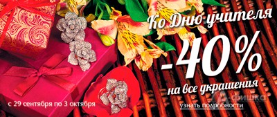 С 29 сентября по 3 октября 2016 г. в ювелирном магазине «Кристалл» в Белгороде ко Дню учителя действует скидка 40% на все украшения!