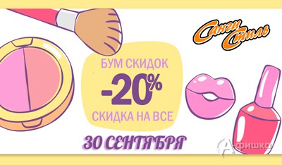 30 сентября 2016 г. в сети магазинов косметики и бытовой химии «Санги Стиль» бум скидок! Действует скидка 20% на весь ассортимент, на декоративную косметику скидки до 40%!