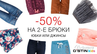 В магазине детской одежды «O’stin Kids» до 3 октября 2016 г. действует скидка 50% на вторые брюки, юбки или джинсы!
