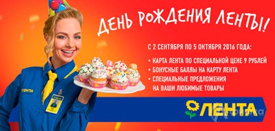Со 2 сентября по 5 октября 2016 г. в гипермаркетах «Лента» в Белгороде для владельцев карт постоянного покупателя проходит акция «День рождения Ленты» – скидки, специальные предложения на любимые товары и бонусные баллы на карту!