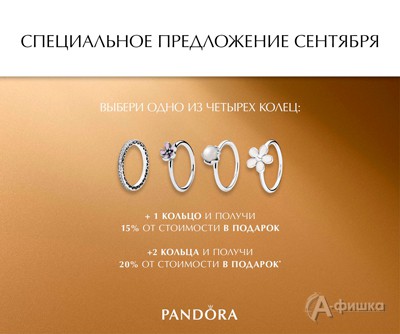 В ювелирных салонах «Pandora» специальное предложение: до 30 сентября 2016 г. скидка 15% при покупке сета из двух колец и скидка 20% – при приобретении сета из трех колец!