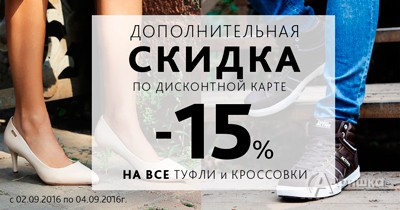 Со 2 по 4 сентября 2016 г. в обувных магазинах «Zenden» в Белгороде действует дополнительная скидка 15% по дисконтной карте на все туфли и кроссовки!