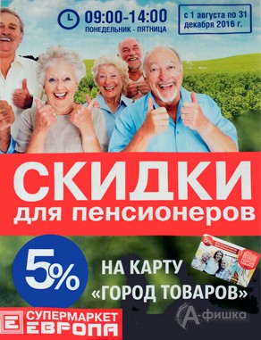 До 31 декабря 2016 г. в супермаркетах «Европа» в Белгороде проходит акция «Пенсионер»! С понедельника по пятницу с 09:00 до 14:00 5% от суммы покупки возвращается на бонусную карту «Город товаров»!