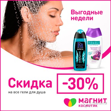 В сети магазинов «Магнит Косметик» проходит акция «Выгодные недели». С 1 по 7 сентября 2016 г. скидка 30% на все гели для душа!