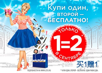 С 1 по 30 сентября 2016 г. в сети магазинов парфюмерии и косметики «Л’Этуаль» проходит акция «Купи один, второй – бесплатно»: при покупке одного товара, второй Вы получаете в подарок!