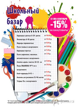 С 1 по 4 сентября 2016 г. в сети магазинов косметики и бытовой химии «Идея» проходит Школьный базар – действует скидка 15% на канцтовары!