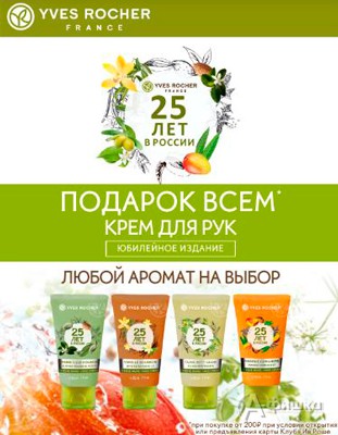 В бутиках косметики «Ив Роше» проходит праздничная акция – с 29 августа по 11 сентября 2016 г. юбилейное издание крема для рук в подарок каждому покупателю и скидки до 25% на любимые продукты!