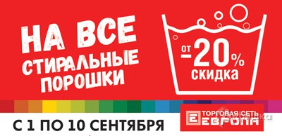 С 1 по 10 сентября 2016 г. в магазинах «Европа» в Белгороде проходит суперакция – на все стиральные порошки скидки от 20%!