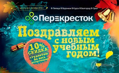 В честь нового Учебного года в супермаркетах «Перекрёсток» в Белгороде до 6 сентября 2016 г. с 14:00 до 16:00 часов по будням проходит акция – студентам предоставляется скидка 10% на весь ассортимент!
