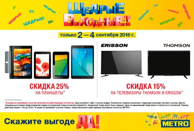 В «METRO Cash & Carry» в Белгороде каждую неделю проходит акция «Щедрые выходные»! Только со 2 по 4 сентября 2016 г. скидка 25% на планшеты, скидка 15% на телевизоры Thomson и Erisson.
