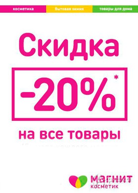 Только 27 августа 2016 г. в сети магазинов «Магнит Косметик» в Белгороде действует скидка 20% на все товары!