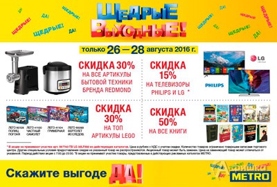 В «METRO Cash & Carry» в Белгороде каждую неделю проходит акция «Щедрые выходные»! Только с 26 по 28 августа 2016 г. скидка 30% на бытовую технику Redmond, скидка 15% на телевизоры Philips и LG, скидка 30% на топ-артикулы Lego, скидка 50% на все книги!