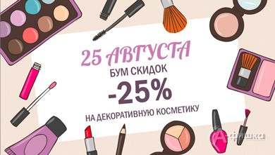 25 августа 2016 г. в сети магазинов косметики и бытовой химии «Санги Стиль» снова бум скидок! Действует скидка 25% на всю декоративную косметику!