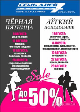 В августе 2016 г. в сети магазинов парфюмерии, косметики и бытовой химии «7 дней» в Белгороде проходит акция «Чёрная пятница – Лёгкий понедельник» – скидки до 50% на различные группы товаров!