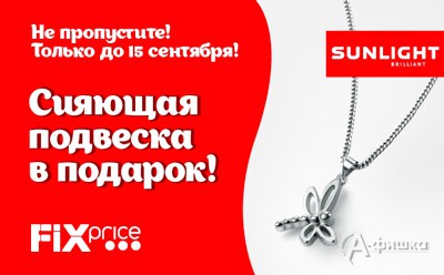 Только до 15 сентября 2016 г. в магазинах низких цен «Fix Price» проходит акция: совершите единовременную покупку на сумму от 300 руб. и более и получите подарок – сияющую подвеску в виде стрекозы от Sunlight!