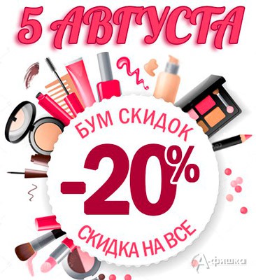 5 августа 2016 г. в сети магазинов косметики и бытовой химии «Санги Стиль» снова бум скидок! Действует скидка 20% на все товары!